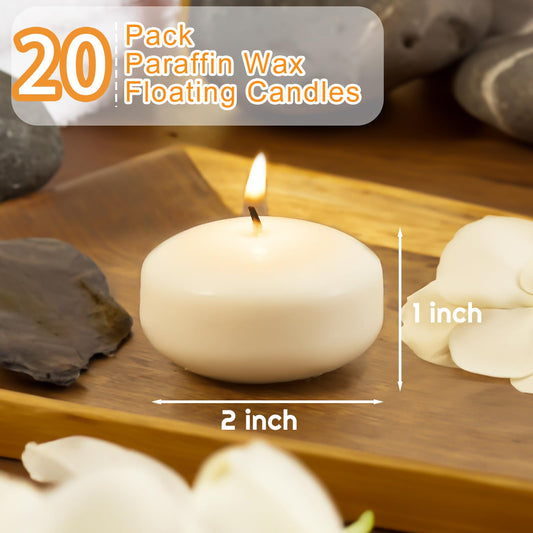 DILILILI 20 Pack Unscented Floating Candles 2 inch, White Floating Candles for Centerpieces with 5+ Hours Long Burn Time, Dripless Wax Discs Smokeless Floating Candles for Holiday, Weddings,Home